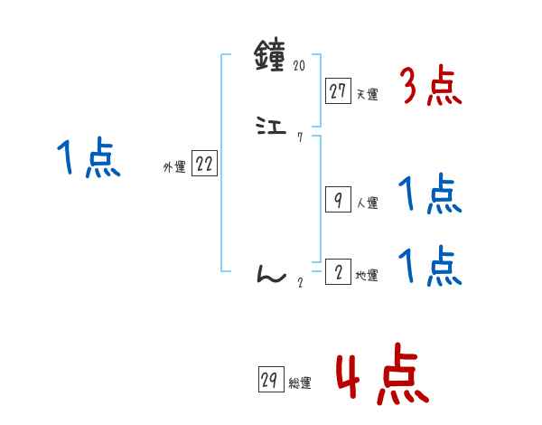 総運![]() | 鐘江んさんの総運は29画の4つ星!完全主義で才能がある。厳格な心の持ち主。 あなたの人生を表す1番重要な運勢です。生涯を通じて影響する総合運となり、主に50歳以降の晩年期に影響を及ぼします。 |