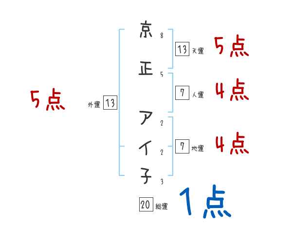 天運![]() | 京正アイ子さんの天運は13画の5つ星!才能に恵まれ人気がある。名声を手に入れる。円満な人生。 家系が持つ宿命的な運勢を表します。祖先から受け継いだ苗字ですので自分の力が及びません。家柄を象徴します。 |