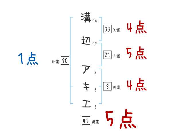 天運![]() | 溝辺アキエさんの天運は33画の4つ星!権力志向でプライドが高い。勇気があり運を切り開き成功する。 家系が持つ宿命的な運勢を表します。祖先から受け継いだ苗字ですので自分の力が及びません。家柄を象徴します。 |