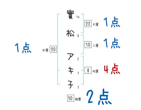 天運![]() | 實松アキ子さんの天運は22画の1つ星!努力することが苦手ないっぽう手先が器用。芸術性にも優れる。 家系が持つ宿命的な運勢を表します。祖先から受け継いだ苗字ですので自分の力が及びません。家柄を象徴します。 |