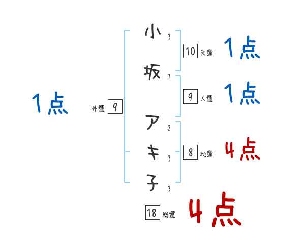 外運![]() | 小坂アキ子さんの外運は9画の1つ星!消極的で才能を発揮することが苦手なことも。周りの意見に耳を傾けましょう。 生活面を象徴する運勢です。外部から受ける影響力を表し、結婚運、家庭運や職場、環境への順応性を表します。 |