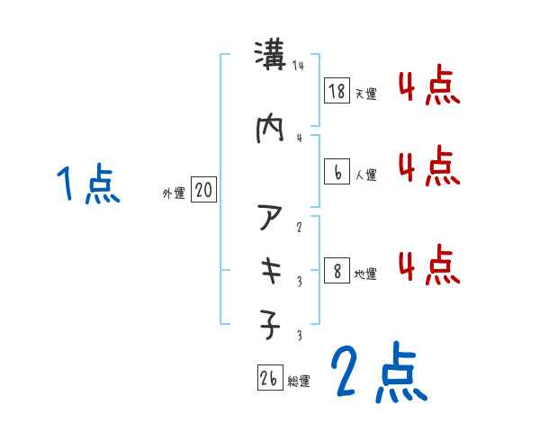 天運![]() | 溝内アキ子さんの天運は18画の4つ星!情熱的で剛気。忍耐力があり信頼される。 家系が持つ宿命的な運勢を表します。祖先から受け継いだ苗字ですので自分の力が及びません。家柄を象徴します。 |