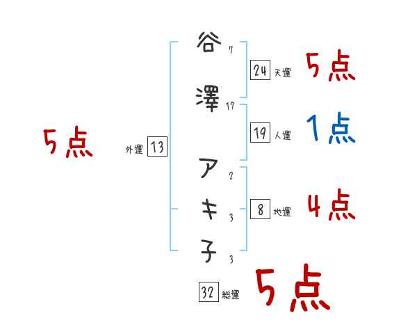 総運![]() | 谷澤アキ子さんの総運は32画の5つ星!柔軟性があり成功する。チャンスが多く金運が良い。 あなたの人生を表す1番重要な運勢です。生涯を通じて影響する総合運となり、主に50歳以降の晩年期に影響を及ぼします。 |