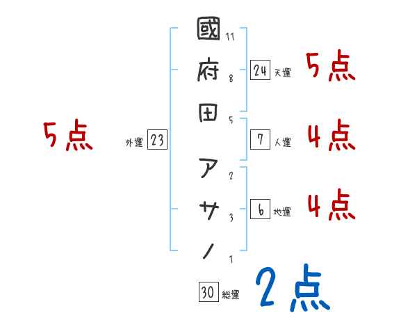総運![]() | 國府田アサノさんの総運は30画の2つ星!浮き沈みの激しさに注意しましょう。 あなたの人生を表す1番重要な運勢です。生涯を通じて影響する総合運となり、主に50歳以降の晩年期に影響を及ぼします。 |