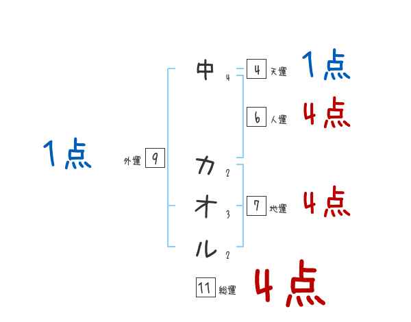 天運![]() | 中カオルさんの天運は4画の1つ星!感情が不安定で苦労するかも。周囲との協調を心掛けましょう。 家系が持つ宿命的な運勢を表します。祖先から受け継いだ苗字ですので自分の力が及びません。家柄を象徴します。 |