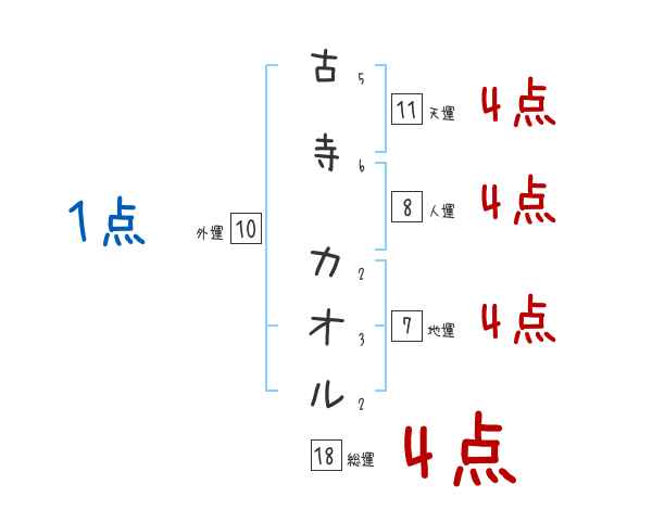 天運![]() | 古寺カオルさんの天運は11画の4つ星!着実に富や地位を得る幸運な人生。 家系が持つ宿命的な運勢を表します。祖先から受け継いだ苗字ですので自分の力が及びません。家柄を象徴します。 |