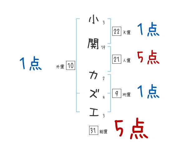 人運![]() | 小関カズエさんの人運は21画の5つ星!統率力がある。独立し成功する。名誉を手に入れる。 性格や才能などを表す2番目に重要な運勢です。人間関係や協調性、社会的な成功に影響します。主に20歳から50歳ぐらいまでの中年期の運勢を表します。 |