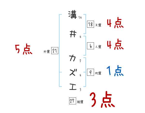 外運![]() | 溝井カズエさんの外運は21画の5つ星!統率力がある。独立し成功する。名誉を手に入れる。 生活面を象徴する運勢です。外部から受ける影響力を表し、結婚運、家庭運や職場、環境への順応性を表します。 |