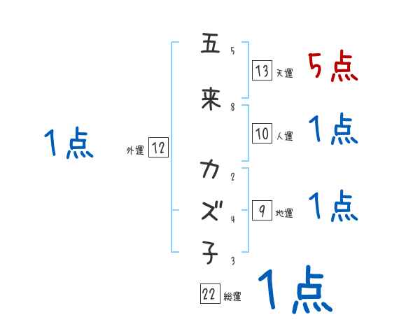 総運![]() | 五来カズ子さんの総運は22画の1つ星!努力することが苦手ないっぽう手先が器用。芸術性にも優れる。 あなたの人生を表す1番重要な運勢です。生涯を通じて影響する総合運となり、主に50歳以降の晩年期に影響を及ぼします。 |