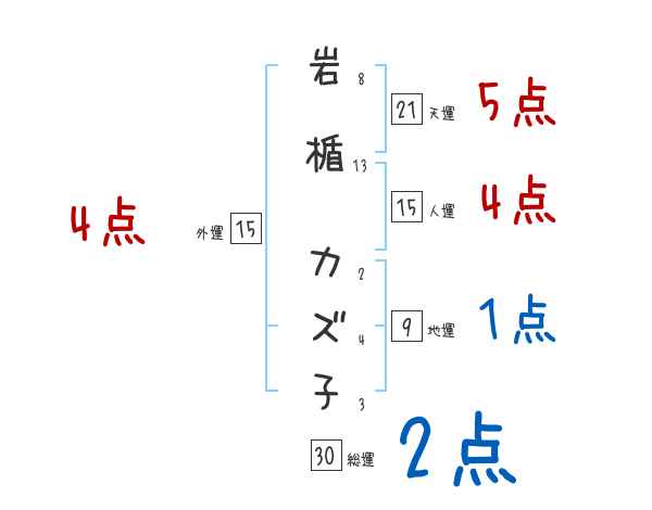 天運![]() | 岩楯カズ子さんの天運は21画の5つ星!統率力がある。独立し成功する。名誉を手に入れる。 家系が持つ宿命的な運勢を表します。祖先から受け継いだ苗字ですので自分の力が及びません。家柄を象徴します。 |