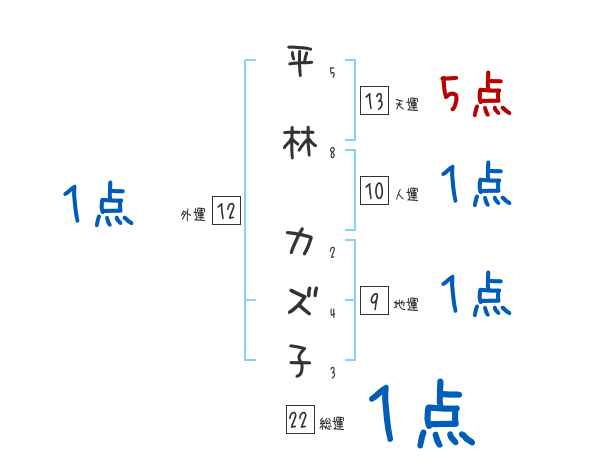 総運![]() | 平林カズ子さんの総運は22画の1つ星!努力することが苦手ないっぽう手先が器用。芸術性にも優れる。 あなたの人生を表す1番重要な運勢です。生涯を通じて影響する総合運となり、主に50歳以降の晩年期に影響を及ぼします。 |
