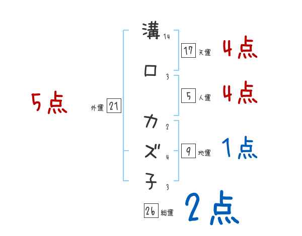 外運![]() | 溝口カズ子さんの外運は21画の5つ星!統率力がある。独立し成功する。名誉を手に入れる。 生活面を象徴する運勢です。外部から受ける影響力を表し、結婚運、家庭運や職場、環境への順応性を表します。 |