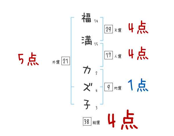 外運![]() | 福満カズ子さんの外運は21画の5つ星!統率力がある。独立し成功する。名誉を手に入れる。 生活面を象徴する運勢です。外部から受ける影響力を表し、結婚運、家庭運や職場、環境への順応性を表します。 |