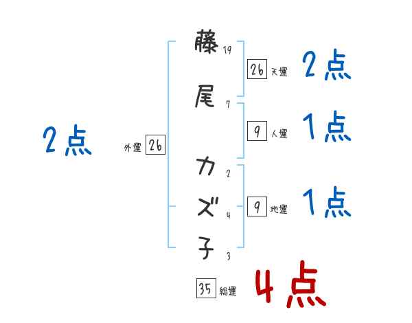 外運![]() | 藤尾カズ子さんの外運は26画の2つ星!波瀾万丈かも。信頼できる人を大事にしましょう。 生活面を象徴する運勢です。外部から受ける影響力を表し、結婚運、家庭運や職場、環境への順応性を表します。 |