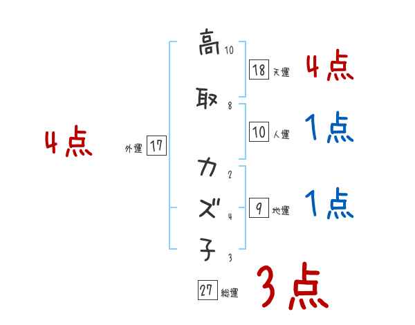 外運![]() | 高取カズ子さんの外運は17画の4つ星!積極的な行動力。地位を気づき財産を手に入れる。純粋な心と直感力。 生活面を象徴する運勢です。外部から受ける影響力を表し、結婚運、家庭運や職場、環境への順応性を表します。 |