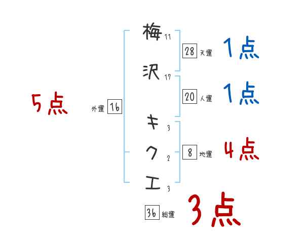 外運![]() | 梅沢キクエさんの外運は16画の5つ星!人望が厚く大きく発展する。逆転成功が見える。 生活面を象徴する運勢です。外部から受ける影響力を表し、結婚運、家庭運や職場、環境への順応性を表します。 |