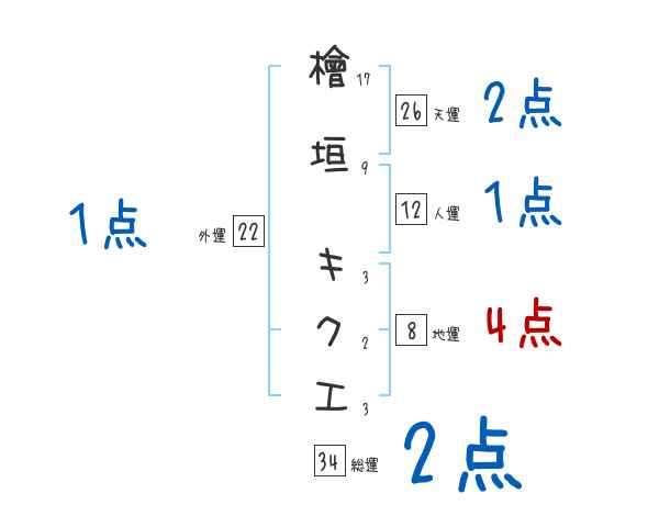 総運![]() | 檜垣キクエさんの総運は34画の2つ星!独創性に優れるが、自尊心が強く災難に注意しましょう。 あなたの人生を表す1番重要な運勢です。生涯を通じて影響する総合運となり、主に50歳以降の晩年期に影響を及ぼします。 |