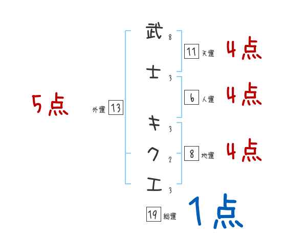 天運![]() | 武士キクエさんの天運は11画の4つ星!着実に富や地位を得る幸運な人生。 家系が持つ宿命的な運勢を表します。祖先から受け継いだ苗字ですので自分の力が及びません。家柄を象徴します。 |