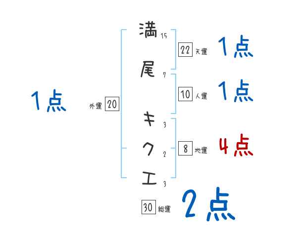 天運![]() | 満尾キクエさんの天運は22画の1つ星!努力することが苦手ないっぽう手先が器用。芸術性にも優れる。 家系が持つ宿命的な運勢を表します。祖先から受け継いだ苗字ですので自分の力が及びません。家柄を象徴します。 |