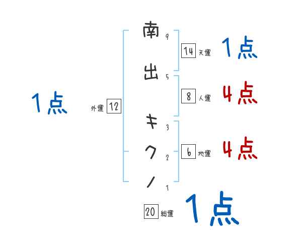 天運![]() | 南出キクノさんの天運は14画の1つ星!人に対して優しいがストレスを溜め込みがち。人間関係のトラブルを避けるよう気をつけましょう。 家系が持つ宿命的な運勢を表します。祖先から受け継いだ苗字ですので自分の力が及びません。家柄を象徴します。 |
