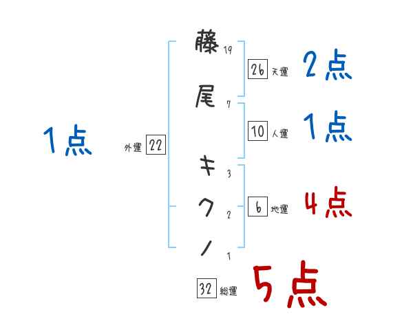 総運![]() | 藤尾キクノさんの総運は32画の5つ星!柔軟性があり成功する。チャンスが多く金運が良い。 あなたの人生を表す1番重要な運勢です。生涯を通じて影響する総合運となり、主に50歳以降の晩年期に影響を及ぼします。 |