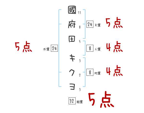 総運![]() | 國府田キクヨさんの総運は32画の5つ星!柔軟性があり成功する。チャンスが多く金運が良い。 あなたの人生を表す1番重要な運勢です。生涯を通じて影響する総合運となり、主に50歳以降の晩年期に影響を及ぼします。 |