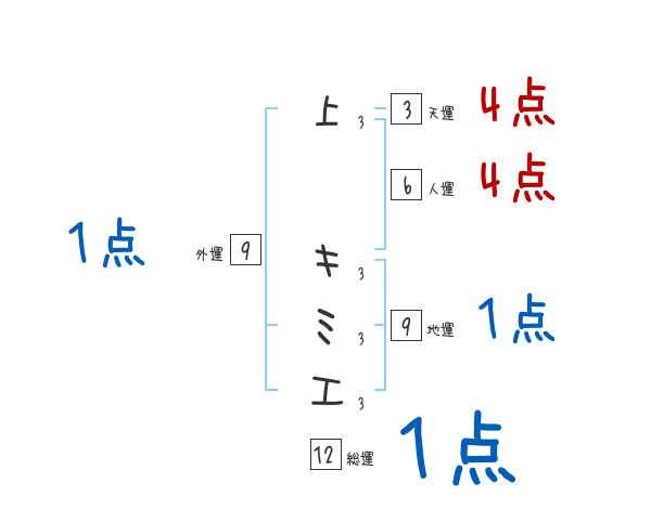 天運![]() | 上キミエさんの天運は3画の4つ星!活動的で才能に恵まれ、多くの信頼を得る。希望に満ち成長する。 家系が持つ宿命的な運勢を表します。祖先から受け継いだ苗字ですので自分の力が及びません。家柄を象徴します。 |