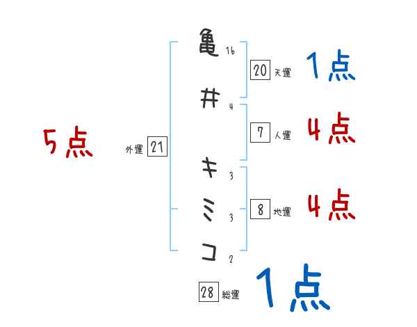 総運![]() | 亀井キミコさんの総運は28画の1つ星!家庭環境に注意。スポーツで活躍できる能力があるかも。 あなたの人生を表す1番重要な運勢です。生涯を通じて影響する総合運となり、主に50歳以降の晩年期に影響を及ぼします。 |