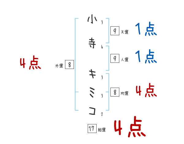 外運![]() | 小寺キミコさんの外運は8画の4つ星!勤勉家。根気強く努力し成功する。忍耐力がある。 生活面を象徴する運勢です。外部から受ける影響力を表し、結婚運、家庭運や職場、環境への順応性を表します。 |