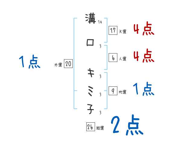 総運![]() | 溝口キミ子さんの総運は26画の2つ星!波瀾万丈かも。信頼できる人を大事にしましょう。 あなたの人生を表す1番重要な運勢です。生涯を通じて影響する総合運となり、主に50歳以降の晩年期に影響を及ぼします。 |