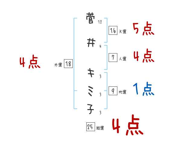 外運![]() | 菅井キミ子さんの外運は18画の4つ星!情熱的で剛気。忍耐力があり信頼される。 生活面を象徴する運勢です。外部から受ける影響力を表し、結婚運、家庭運や職場、環境への順応性を表します。 |