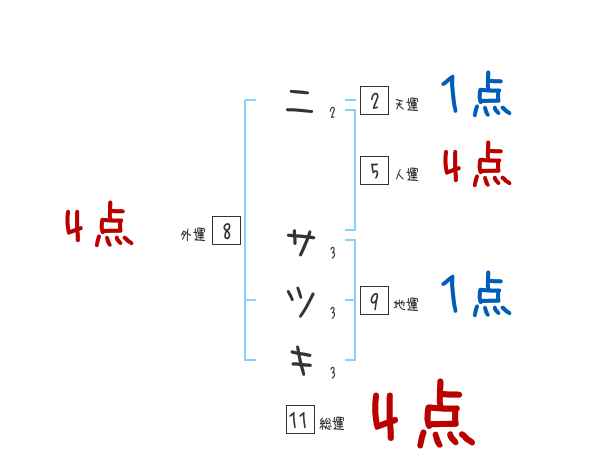 天運![]() | 二サツキさんの天運は2画の1つ星!優しいですが積極性や意思の強さに欠ける傾向があります。家庭環境の乱れに注意しましょう。 家系が持つ宿命的な運勢を表します。祖先から受け継いだ苗字ですので自分の力が及びません。家柄を象徴します。 |