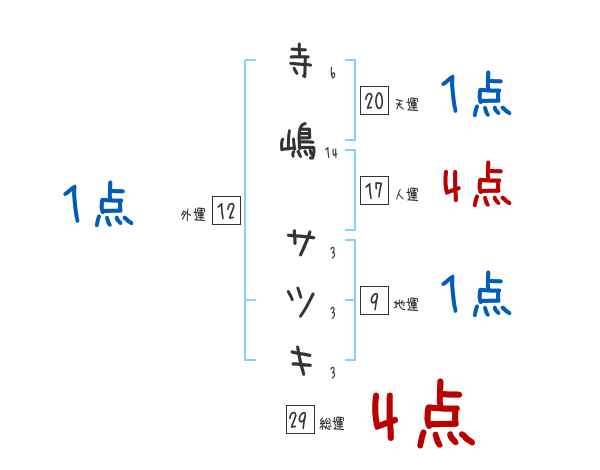 総運![]() | 寺嶋サツキさんの総運は29画の4つ星!完全主義で才能がある。厳格な心の持ち主。 あなたの人生を表す1番重要な運勢です。生涯を通じて影響する総合運となり、主に50歳以降の晩年期に影響を及ぼします。 |