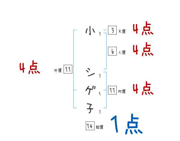 天運![]() | 小シゲ子さんの天運は3画の4つ星!活動的で才能に恵まれ、多くの信頼を得る。希望に満ち成長する。 家系が持つ宿命的な運勢を表します。祖先から受け継いだ苗字ですので自分の力が及びません。家柄を象徴します。 |