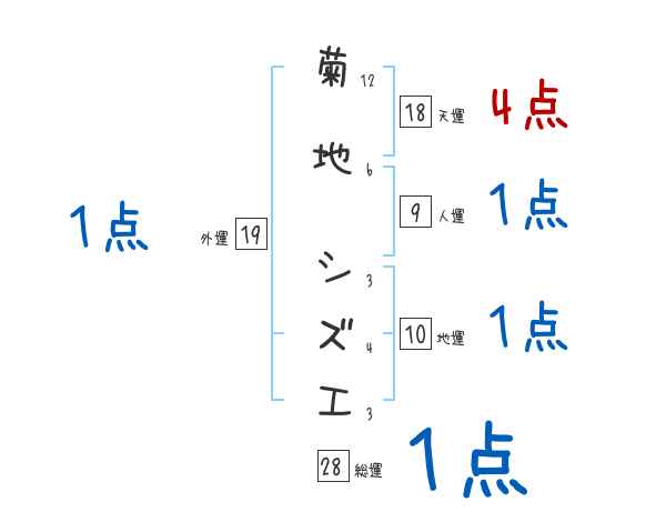 外運![]() | 菊地シズエさんの外運は19画の1つ星!優れた才能を持ちますが、協調性が足りないことも。周りの人と協力する事を意識しましょう。 生活面を象徴する運勢です。外部から受ける影響力を表し、結婚運、家庭運や職場、環境への順応性を表します。 |