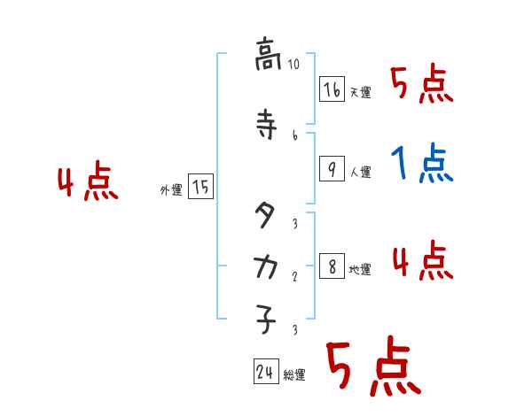 天運![]() | 高寺タカ子さんの天運は16画の5つ星!人望が厚く大きく発展する。逆転成功が見える。 家系が持つ宿命的な運勢を表します。祖先から受け継いだ苗字ですので自分の力が及びません。家柄を象徴します。 |