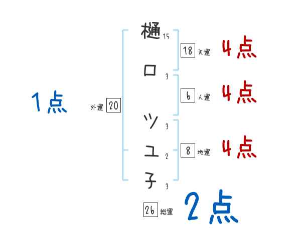 総運![]() | 樋口ツユ子さんの総運は26画の2つ星!波瀾万丈かも。信頼できる人を大事にしましょう。 あなたの人生を表す1番重要な運勢です。生涯を通じて影響する総合運となり、主に50歳以降の晩年期に影響を及ぼします。 |