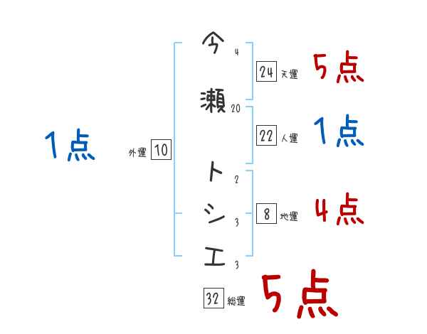 総運![]() | 今瀬トシエさんの総運は32画の5つ星!柔軟性があり成功する。チャンスが多く金運が良い。 あなたの人生を表す1番重要な運勢です。生涯を通じて影響する総合運となり、主に50歳以降の晩年期に影響を及ぼします。 |