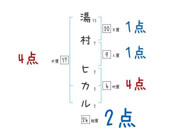 外運![]() | 湯村ヒカルさんの外運は17画の4つ星!積極的な行動力。地位を気づき財産を手に入れる。純粋な心と直感力。 生活面を象徴する運勢です。外部から受ける影響力を表し、結婚運、家庭運や職場、環境への順応性を表します。 |
