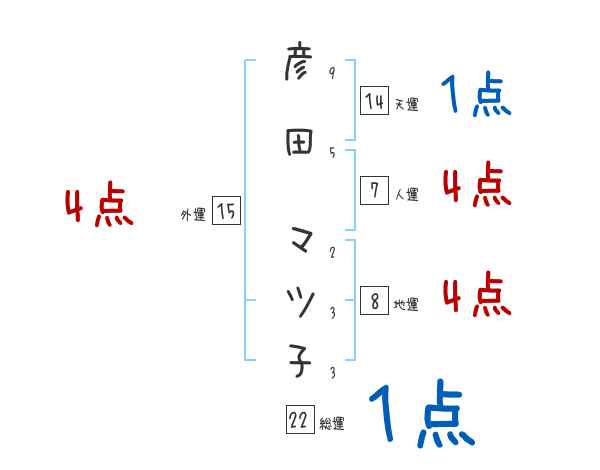 外運![]() | 彦田マツ子さんの外運は15画の4つ星!人徳があり出世する。順調に物事を進め円満な人生。 生活面を象徴する運勢です。外部から受ける影響力を表し、結婚運、家庭運や職場、環境への順応性を表します。 |