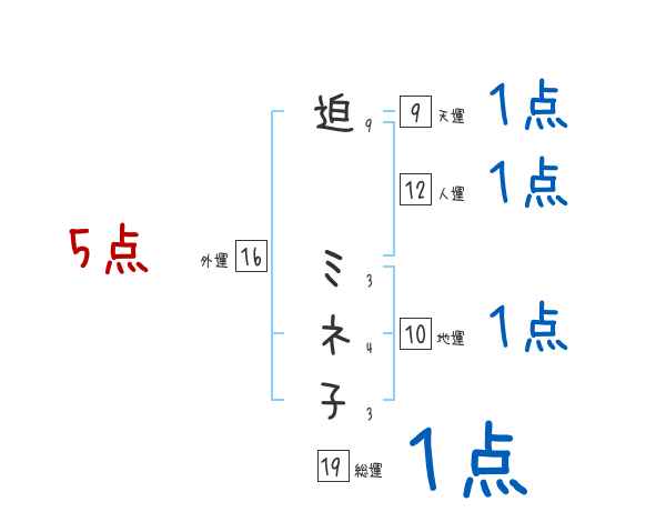 天運![]() | 迫ミネ子さんの天運は9画の1つ星!消極的で才能を発揮することが苦手なことも。周りの意見に耳を傾けましょう。 家系が持つ宿命的な運勢を表します。祖先から受け継いだ苗字ですので自分の力が及びません。家柄を象徴します。 |