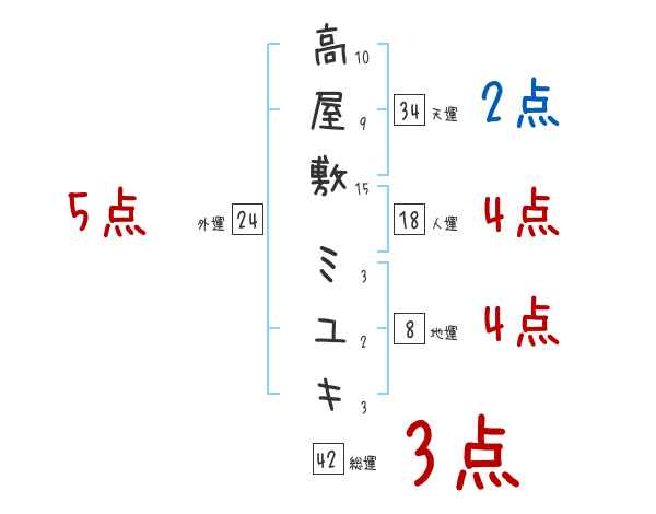 外運![]() | 高屋敷ミユキさんの外運は24画の5つ星!家庭運が良く順調な人生。金運にも恵まれる。 生活面を象徴する運勢です。外部から受ける影響力を表し、結婚運、家庭運や職場、環境への順応性を表します。 |