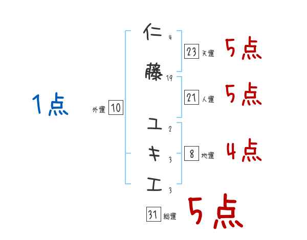 人運![]() | 仁藤ユキエさんの人運は21画の5つ星!統率力がある。独立し成功する。名誉を手に入れる。 性格や才能などを表す2番目に重要な運勢です。人間関係や協調性、社会的な成功に影響します。主に20歳から50歳ぐらいまでの中年期の運勢を表します。 |