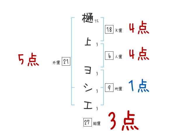 天運![]() | 樋上ヨシエさんの天運は18画の4つ星!情熱的で剛気。忍耐力があり信頼される。 家系が持つ宿命的な運勢を表します。祖先から受け継いだ苗字ですので自分の力が及びません。家柄を象徴します。 |