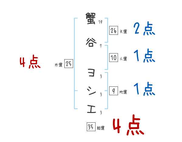 天運![]() | 蟹谷ヨシエさんの天運は26画の2つ星!波瀾万丈かも。信頼できる人を大事にしましょう。 家系が持つ宿命的な運勢を表します。祖先から受け継いだ苗字ですので自分の力が及びません。家柄を象徴します。 |