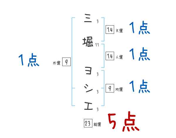 外運![]() | 三堀ヨシエさんの外運は9画の1つ星!消極的で才能を発揮することが苦手なことも。周りの意見に耳を傾けましょう。 生活面を象徴する運勢です。外部から受ける影響力を表し、結婚運、家庭運や職場、環境への順応性を表します。 |