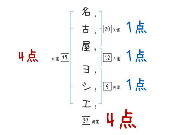総運![]() | 名古屋ヨシエさんの総運は29画の4つ星!完全主義で才能がある。厳格な心の持ち主。 あなたの人生を表す1番重要な運勢です。生涯を通じて影響する総合運となり、主に50歳以降の晩年期に影響を及ぼします。 |