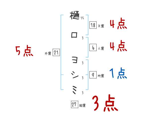 総運![]() | 樋口ヨシミさんの総運は27画の3つ星!頭脳明晰だが強情で摩擦が多い傾向。孤立に注意。 あなたの人生を表す1番重要な運勢です。生涯を通じて影響する総合運となり、主に50歳以降の晩年期に影響を及ぼします。 |