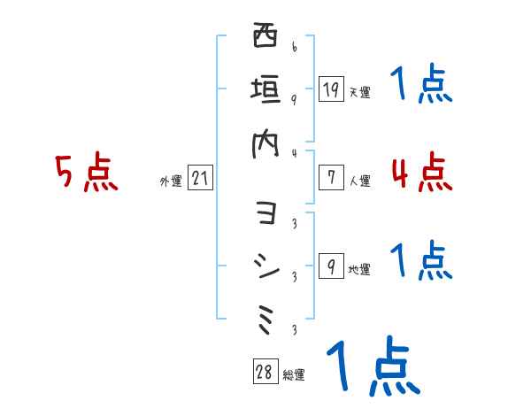 天運![]() | 西垣内ヨシミさんの天運は19画の1つ星!優れた才能を持ちますが、協調性が足りないことも。周りの人と協力する事を意識しましょう。 家系が持つ宿命的な運勢を表します。祖先から受け継いだ苗字ですので自分の力が及びません。家柄を象徴します。 |