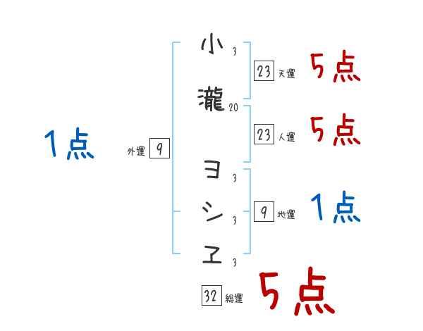 総運![]() | 小瀧ヨシヱさんの総運は32画の5つ星!柔軟性があり成功する。チャンスが多く金運が良い。 あなたの人生を表す1番重要な運勢です。生涯を通じて影響する総合運となり、主に50歳以降の晩年期に影響を及ぼします。 |